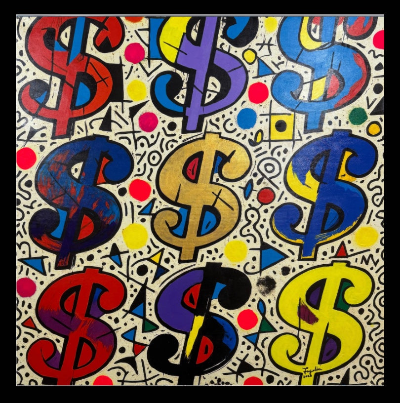 Fenzolini original painting/acrylic "hari miri dollars"- mixed media- 38 x 38"framed