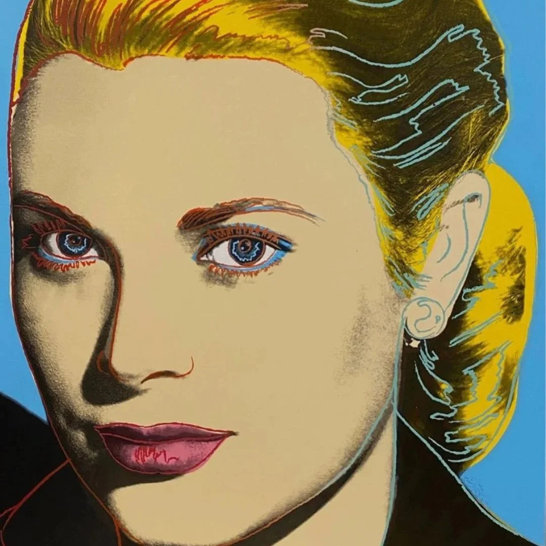 Image from Warhol Grace Kelly done 1987.  Silkscreen– Proof Edition, shipped flat on a reinforced wooden board— never rolled. Top 10 Warhol! A stunning piece.